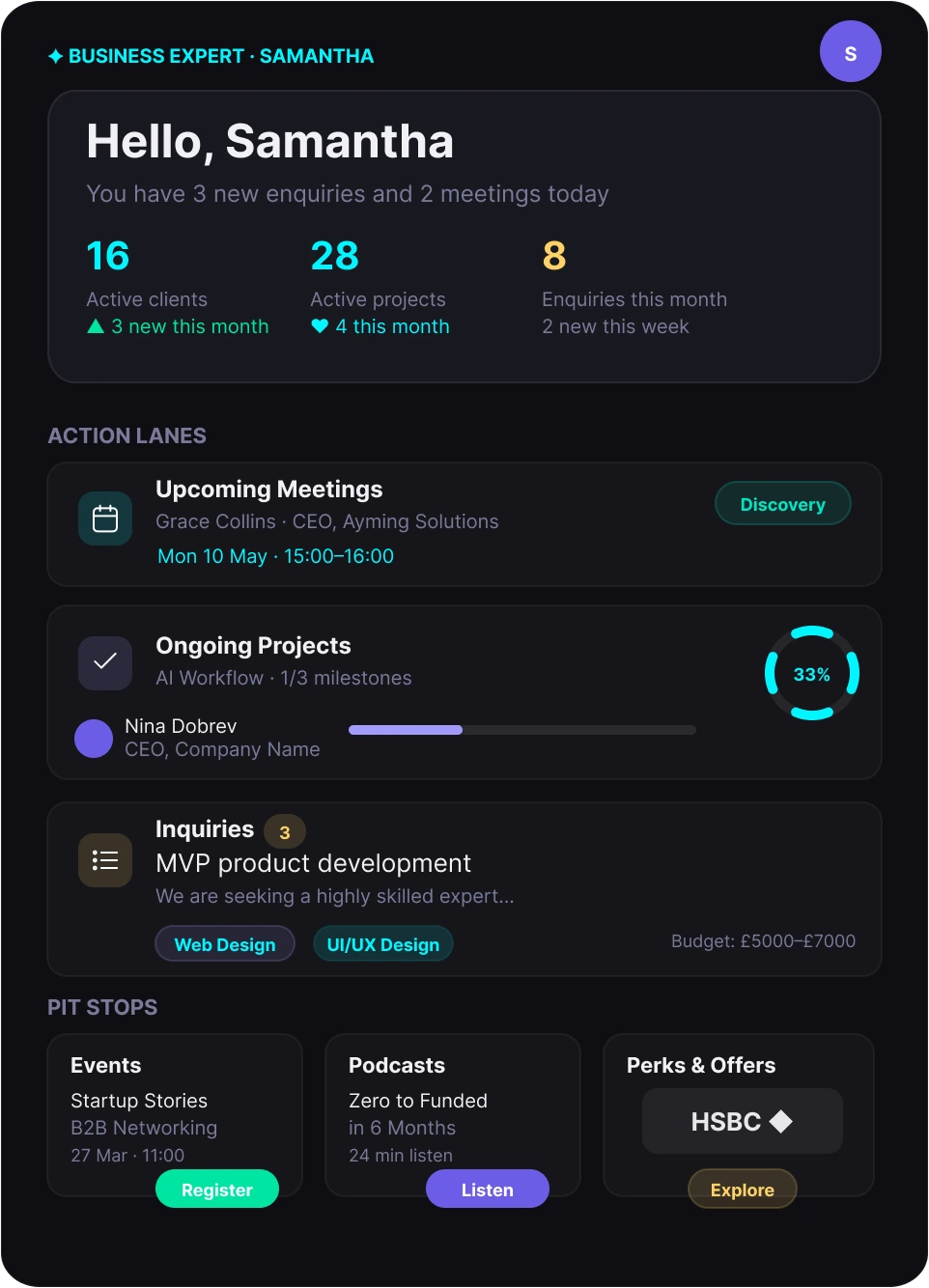 CurvUp gives you access to a curated pipeline of high-potential entrepreneurs actively seeking expert support to build and scale their ventures. Whether you're a coach, mentor, AI expert, marketer, or other business service provider, CurvUp helps you get discovered, get hired, and grow your client base.