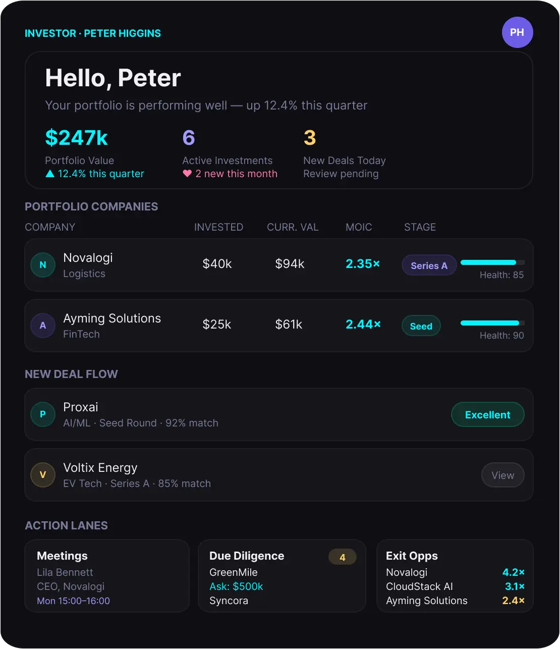 Monitor portfolio performance, stay informed with instant updates, and manage exits all in one dashboard.